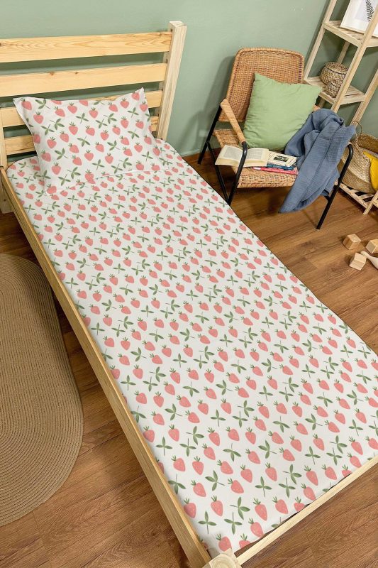 Organik Tek Kişilik Lastikli Çarşaf Seti – Tatlı Çilek Bahçesi