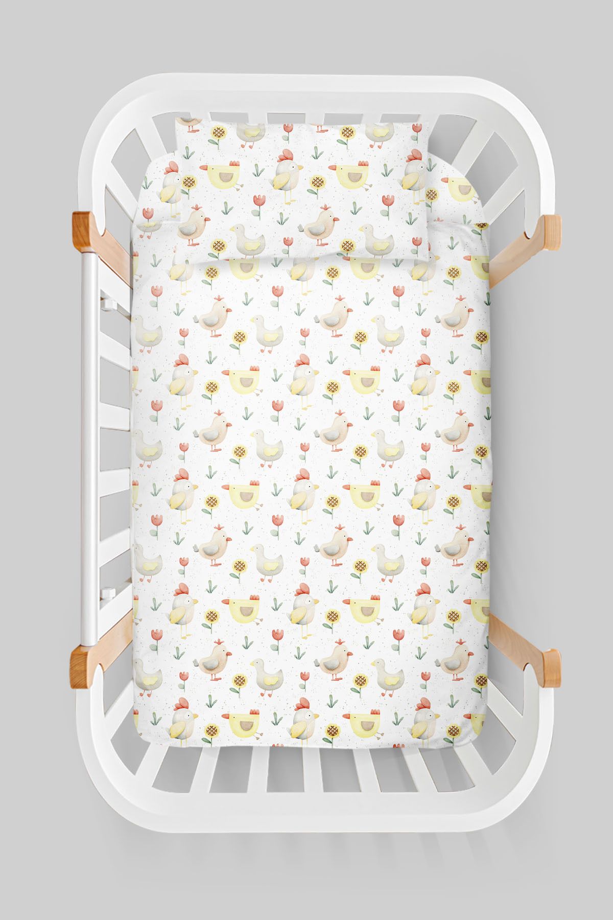 Organik Bebek Boy Lastikli Çarşaf Seti – Ördek ve Tavuk Düşleri